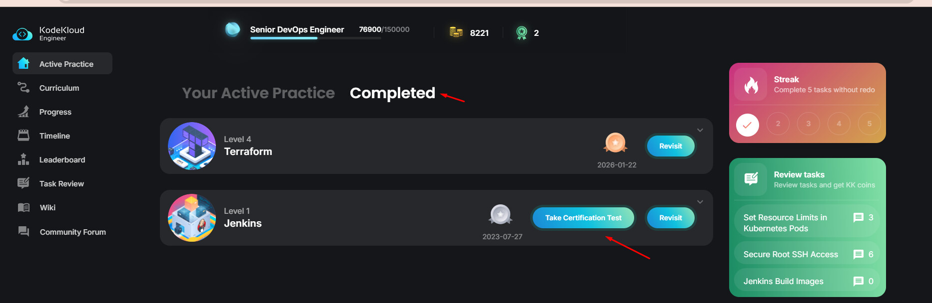 Please go to the Active Practice page again, click on the Completed tab, and choose the course you would like to take the test for.