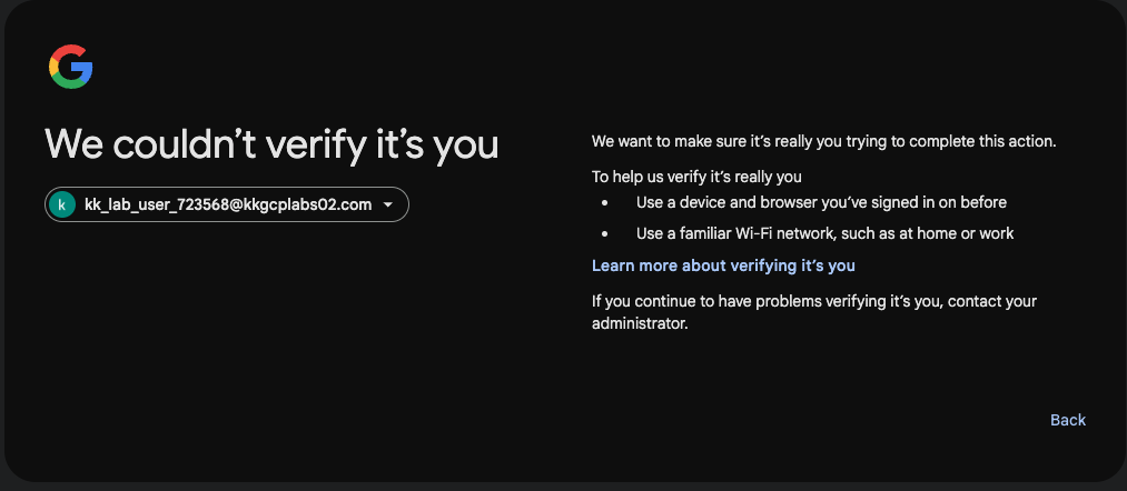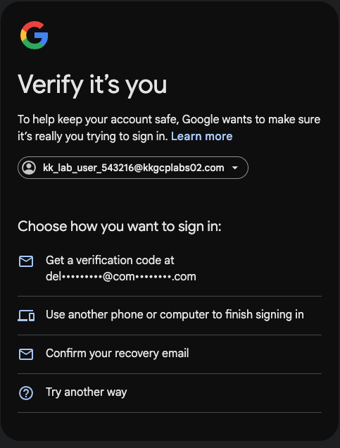 For context, I am just learning to use GCP, I was gonna use the playgrounds (since I have access to GCP and wanted to avoid cost as much as possible). I spin up a GCP playground but I cannot get into the console. I have credentials provided - email, password and employee-ID. Like I do on the AWS platform, I use my incognito mode to open the provided console link, input the email provided and the password, then I am prompted to chose an option (kinda like a MFA), I don’t know which option to select at this point (please see screenshot below). I have used all the options and I am never prompted to use an “Employee ID”.