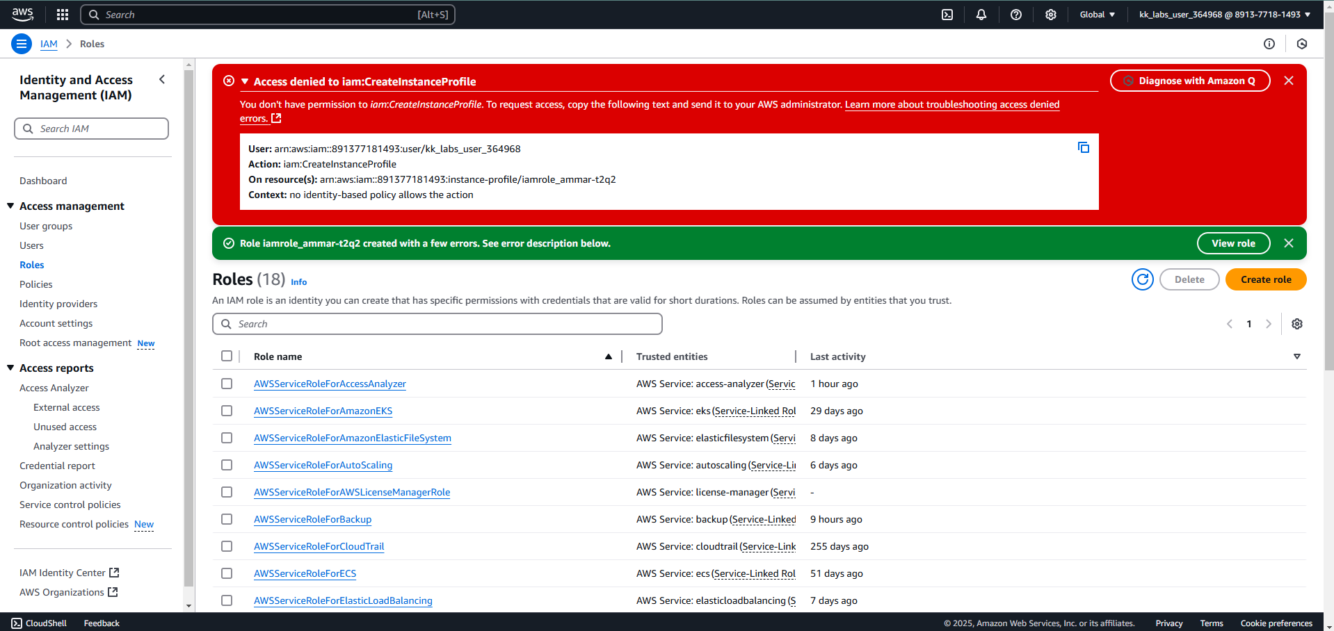 I got an access denied error while creating EC2 user as per instruction in the lab.