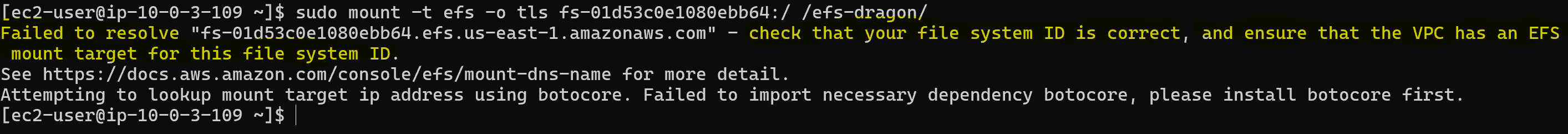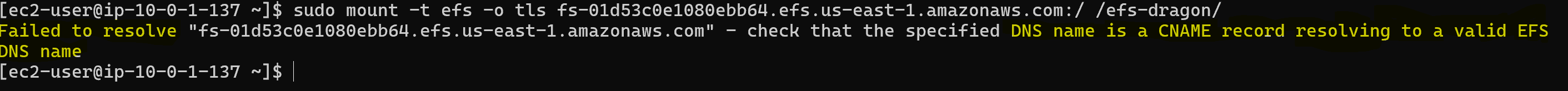 Now when I try to mount the EFS file system on either instances I get the following errors: