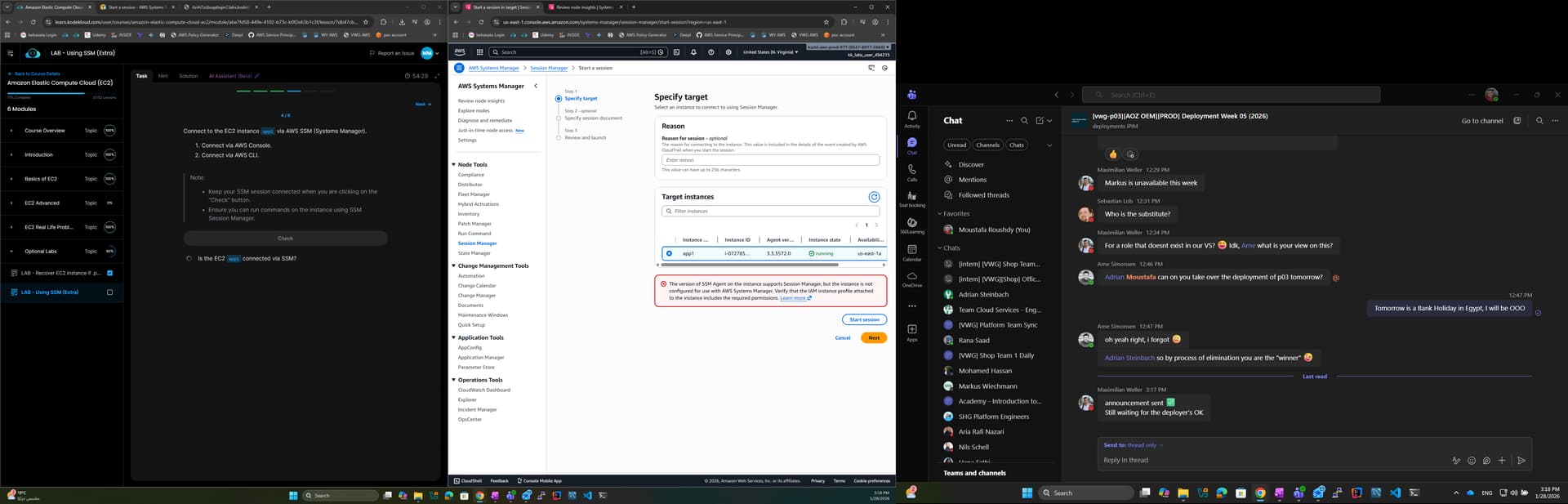 I see the same error you see here; I don’t think the supplied EC2LabInstanceProfile role suffices for the lab. I’ve asked the AWS team to investigate.
