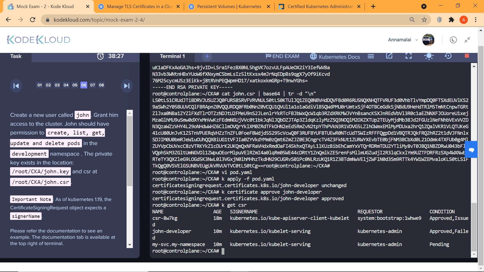 kubectl create rolebinding developer-role-binding --role=developer --user=john --namespace=development