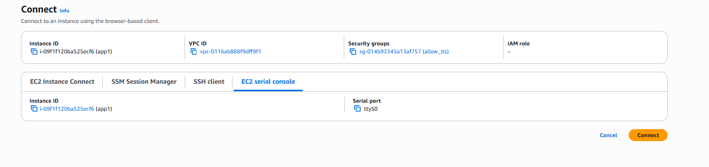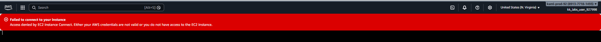 Hi I tried to connect to the instance and I cannot ssh from lab consolo or using ec2 to check if the app1 or app2 servers are servicing. However I managed to get a different message this time.