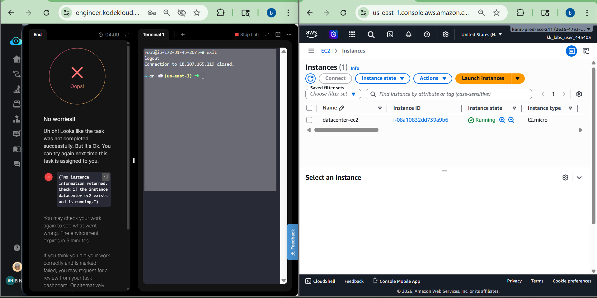 I tried “Day 37: Managing EC2 Access with S3 Role-based Permissions” of “100 days of AWS cloud” for more than 3 times but I always face issue after submitting with error message “No instance information returned for datacenter-ec2 instance” but the instance does exists (attached screenshot). Does anyone face this issue? If so what was the workaround to make sure the lab validation script identifies that the ec2 instance exists?