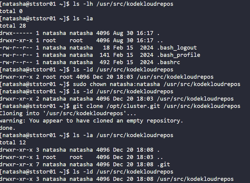 /usr/src/kodekloudreposdirectory. Perform this task using the natasha user, and ensure that no modifications are made to the repository or existing directories, such as changing permissions or making unauthorized alterations