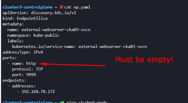 Once you create the EndpointSlics resource with the correct name, label matching the Service and IP address of the student-node. You can create a test Pod in the kube-public namespace and curl the Service, and you should be able to reach the external web server.