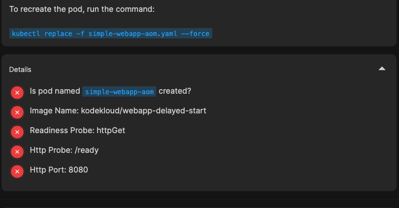 3. I used k replace -f simple-webapp-aom.yaml --force, same as in the explaiantion.