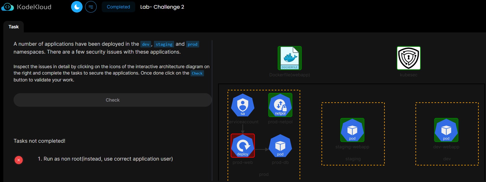 It is possible to forgot to update the user in the Dockerfile and that check to fail due to this reason, but yes, the UI is not working properly for all the Challenges, it’s a bit difficult to see what are the steps that need to be done, because the clicks are working only sometimes, after you first click on other part of the schema, but not necessarily, anyway, in the end it worked if the solution implemented is fully correct,