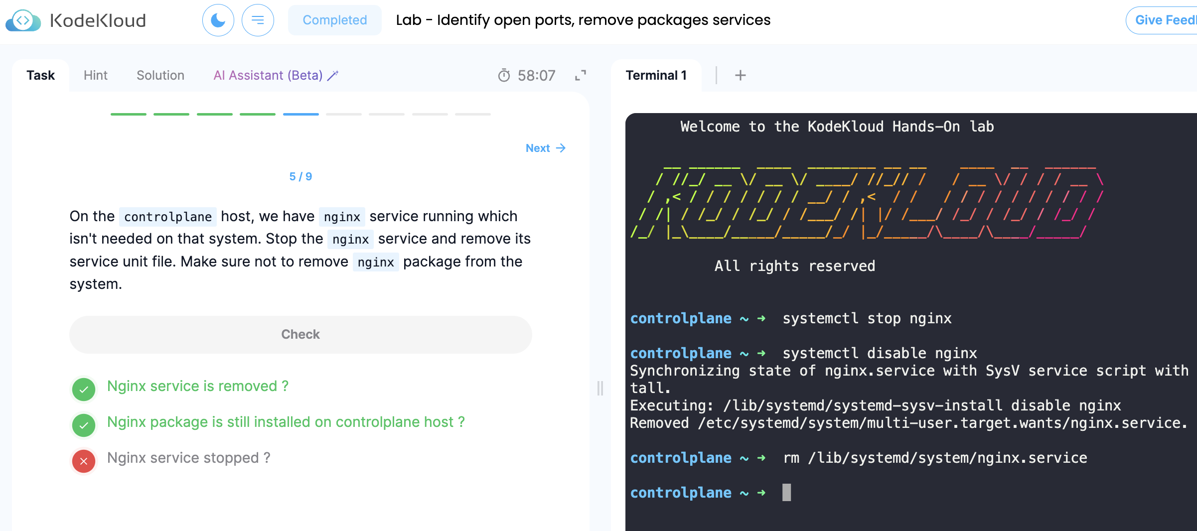 The grader here, for whatever reason, does not want you to disable the service, just to stop the service and remove the unit file. It’s a questionable choice, but it’s a choice
