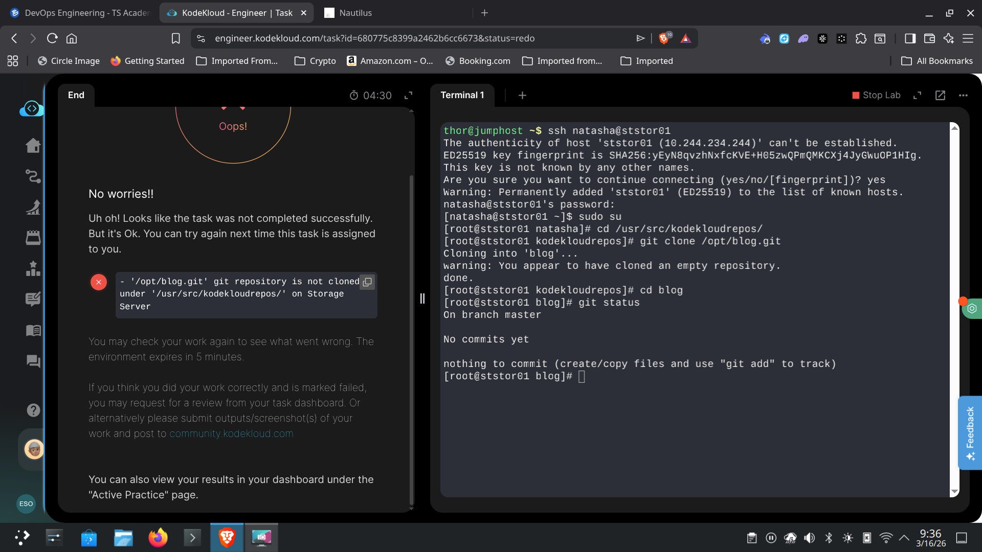 • ‘/opt/beta.git’ git repository is not cloned under ‘/usr/src/kodekloudrepos/’ on Storage Server