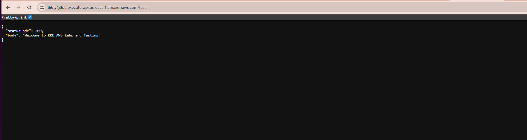 When I access my API Invoke URL in the browser, the output is correctly formatted with spaces: “Welcome to KKE AWS Labs”.