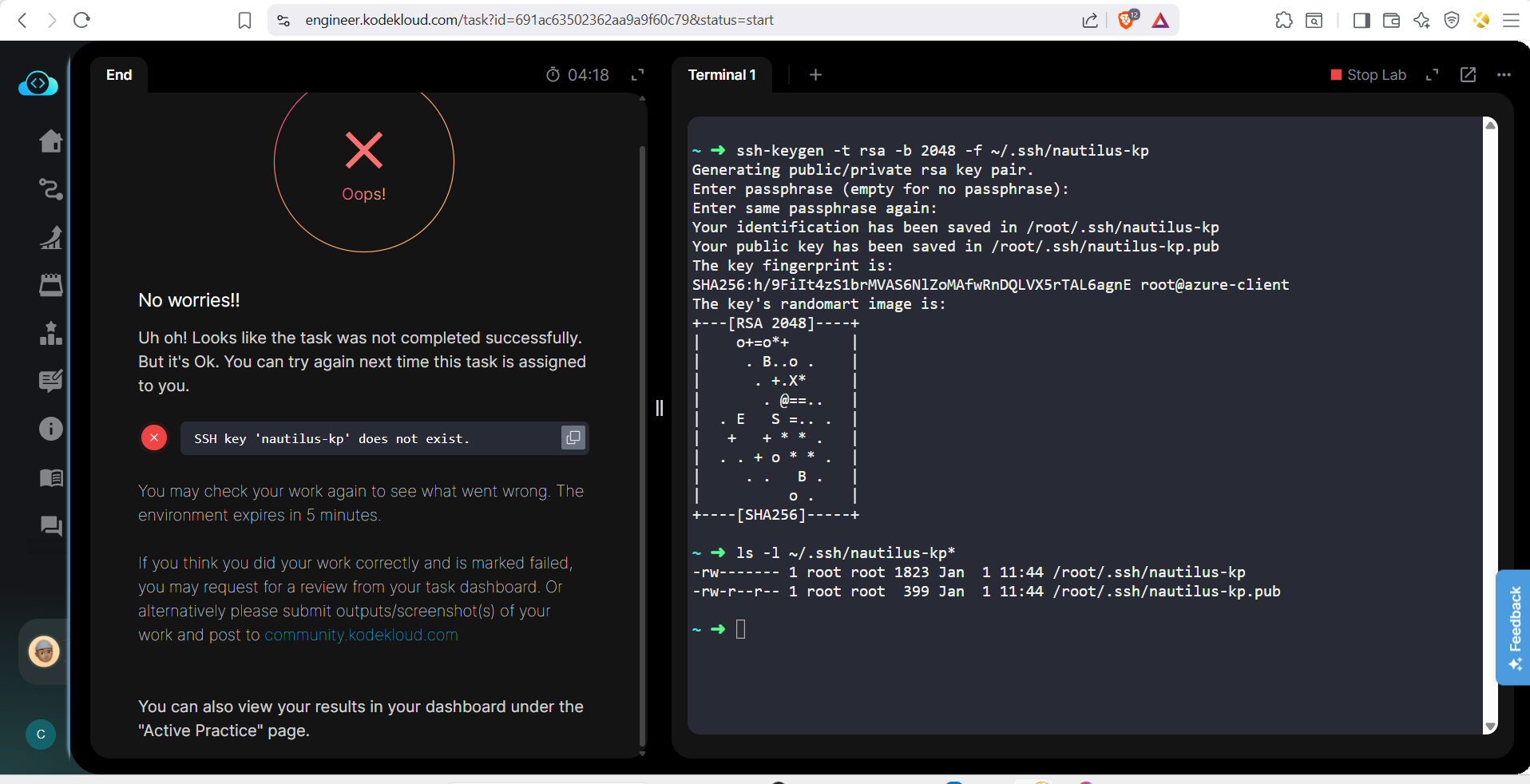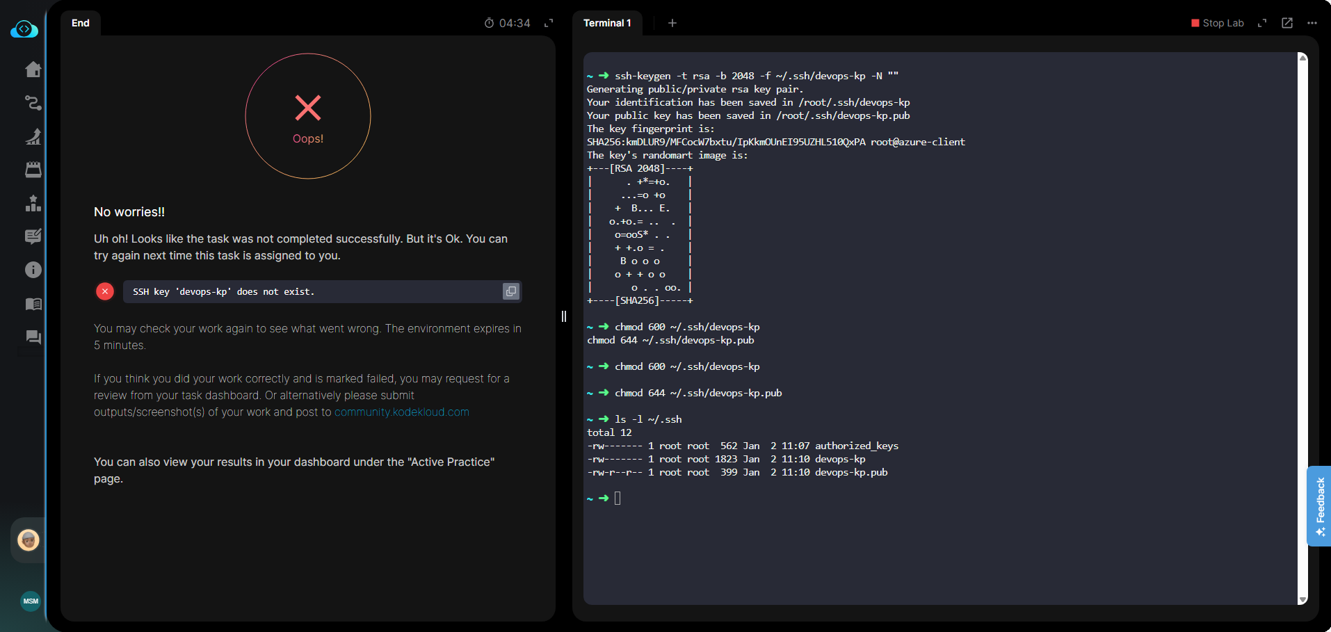 You should not create the SSH Key in the terminal. Instead, you should create one on the Azure Portal. Use the credentials provided in the description to login.
