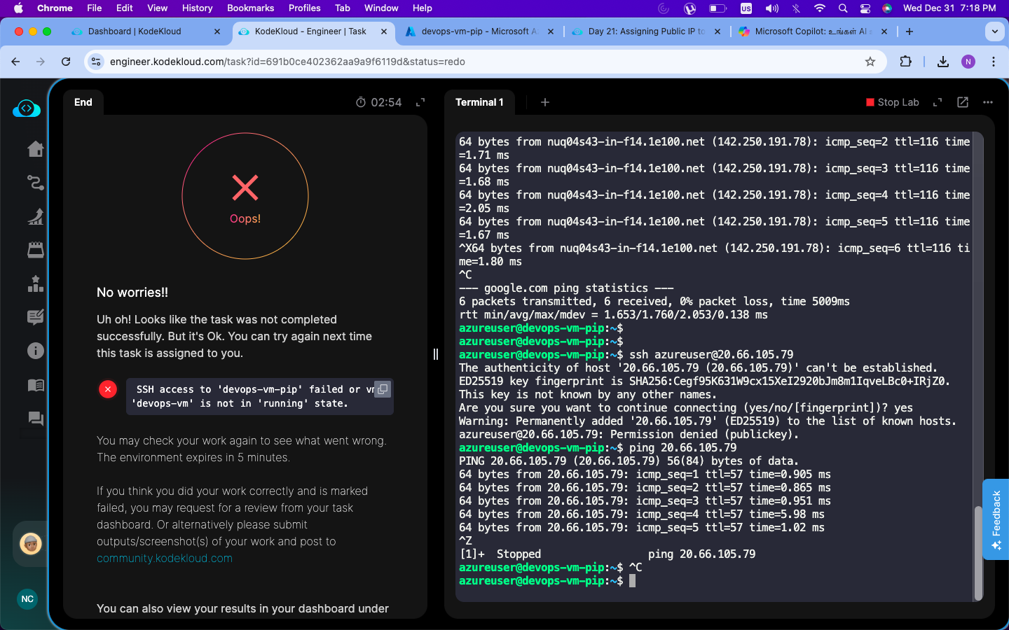 As you see, I have attached the public ip as the primary ip and I was able to login the vm and able to ping the public ip. Still I am not able to move forward to the next task. Could someone let me know what am I missing.