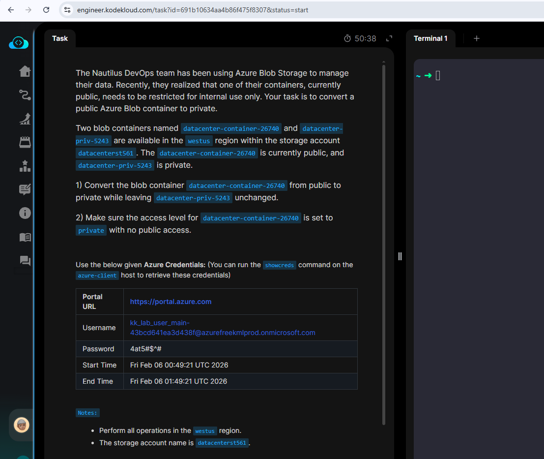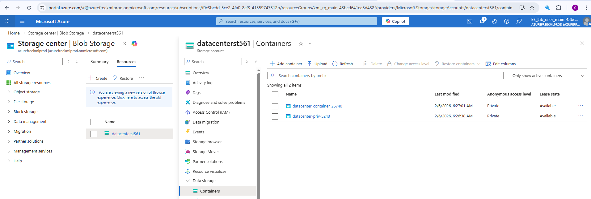 When I did the lab, both containers were visible, one with “Container” access, and one with “Private” access. Setting the one with “Container” access was pretty simple in the console.