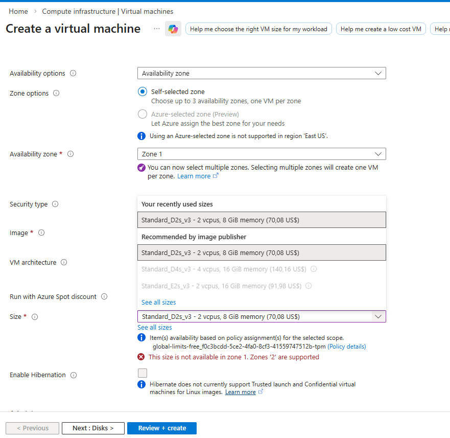 The exercise asks to create an Ubuntu 22.04 LT virtual machine with size Standard_B1s and it cannot be selected.