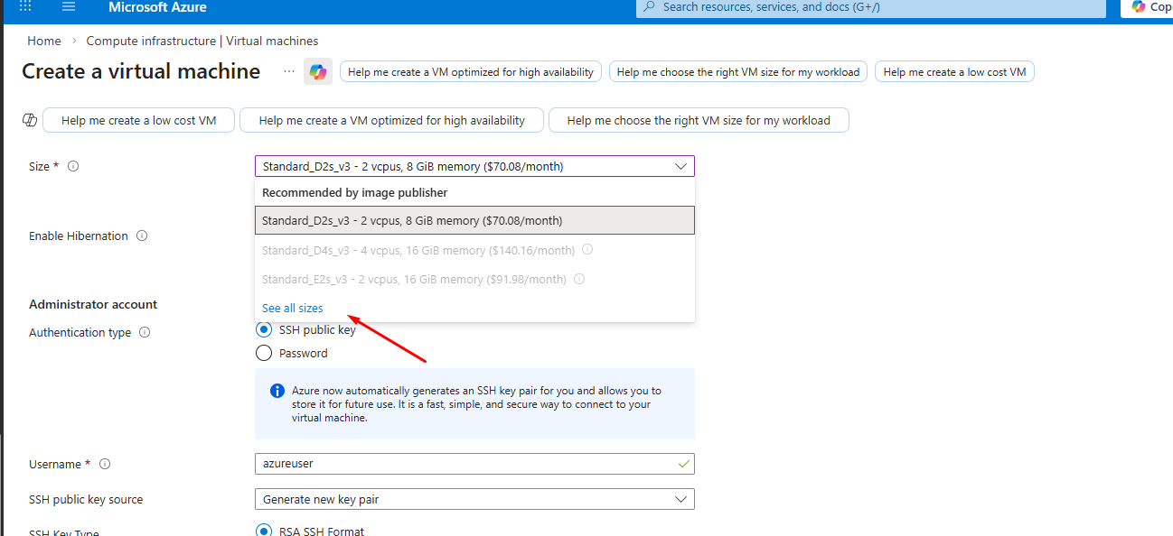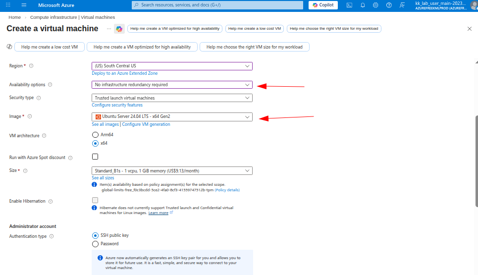 In the Availability options, select No infrastructure redundancy required and choose the correct Region.