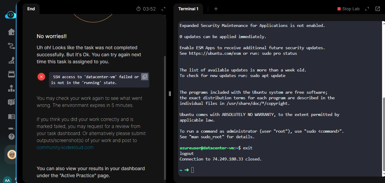 I Completed all the task, generating an SSH public key on the azure-client host and associating it with the VM created for SSH access, also associated a public IP with the VM. I was able to SSH into the VM and it was in running state but I keep getting marked wrong.