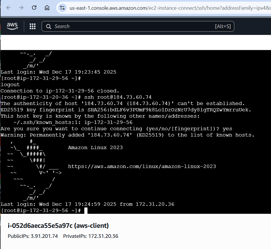 I was able to ssh from aws-client to the devops-ec2, using the id_rsa key that I generaed using ssh-keygen in /root/.ssh on aws-client, after adding the public key to the devops-ec2/root/.ssh/authorized-keys.