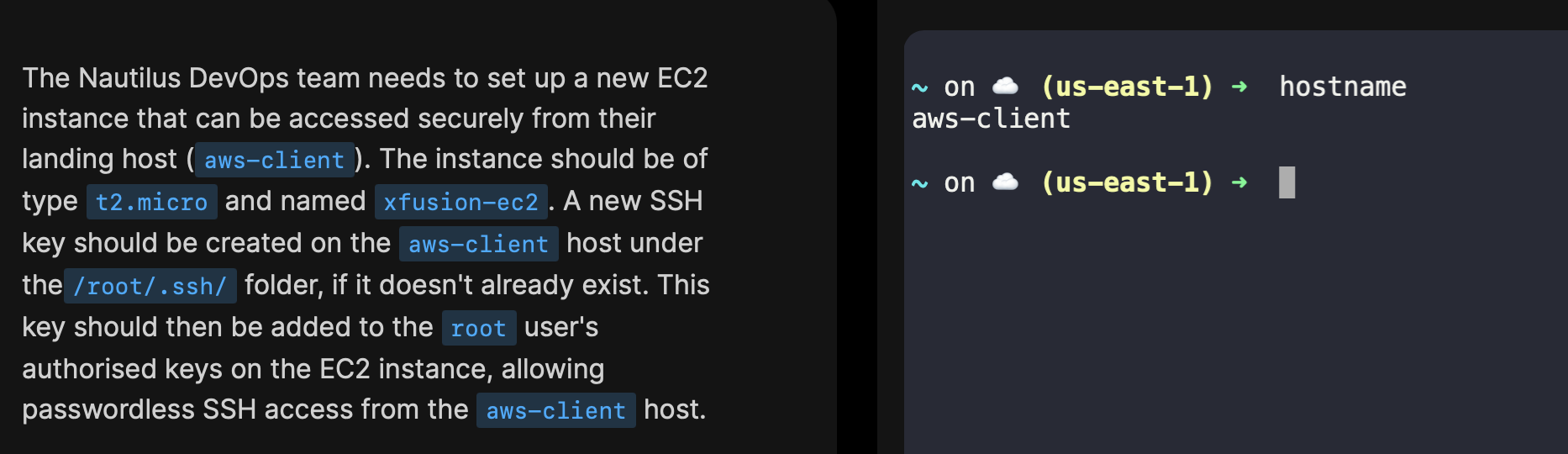 Once you load the task, ideally you should have access to a terminal which is aws-client, from which you are supposed to setup passwordless SSH access to the VM that you are asked to create.