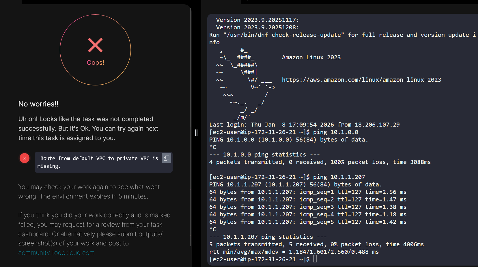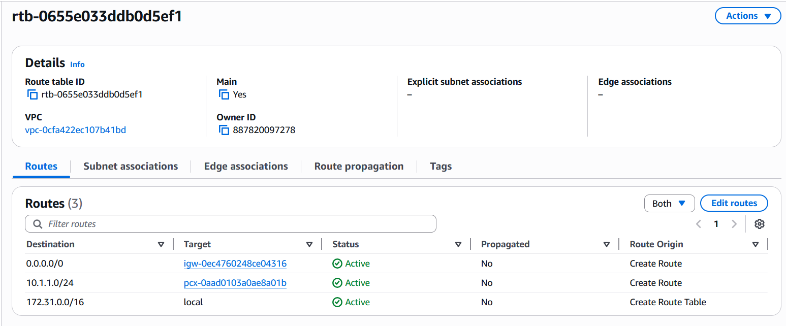 Route from the default VPC to the private VPC is missing.” Why is this being reported? The routing between the public VPC and the private VPC appears to be configured correctly. I have also tested connectivity by pinging from a private EC2 instance to a public EC2 instance, and the ping was successful.