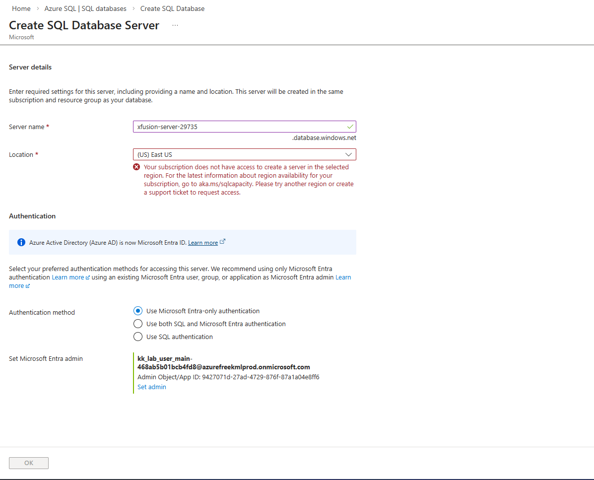 It is asked to create a server in the east us region but the subscription doesn’t have access