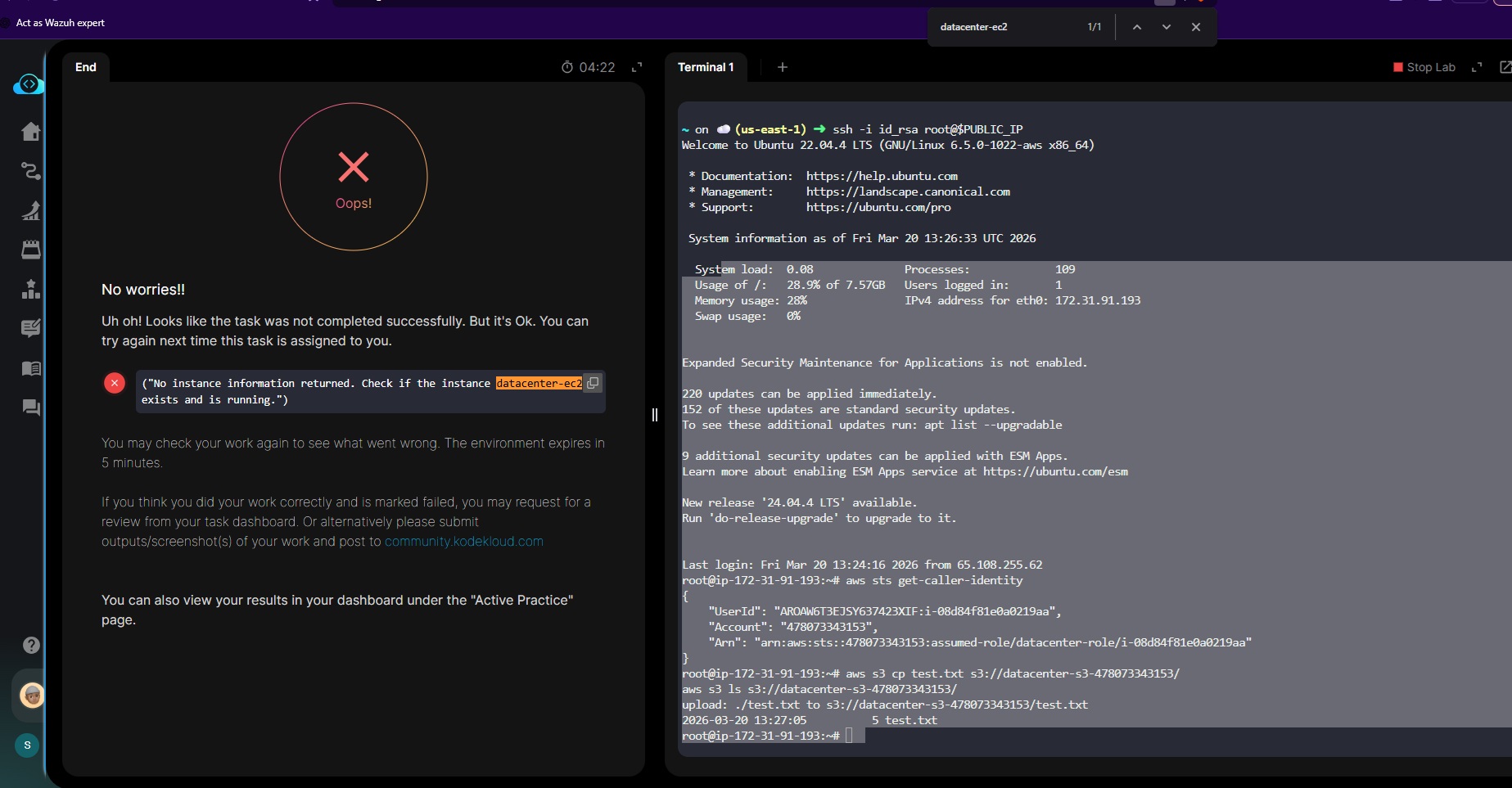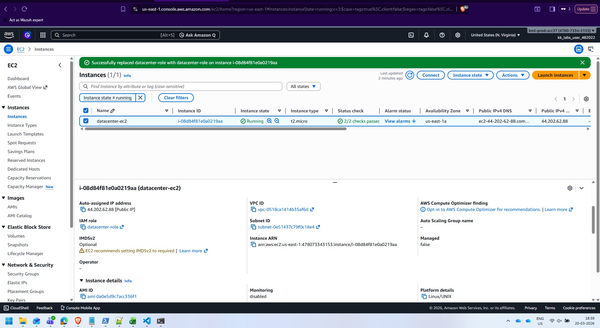 While working in Lab 37 in AWS section I am getting failure even though role attached, it always says that the instance is not available or instance is not exist.