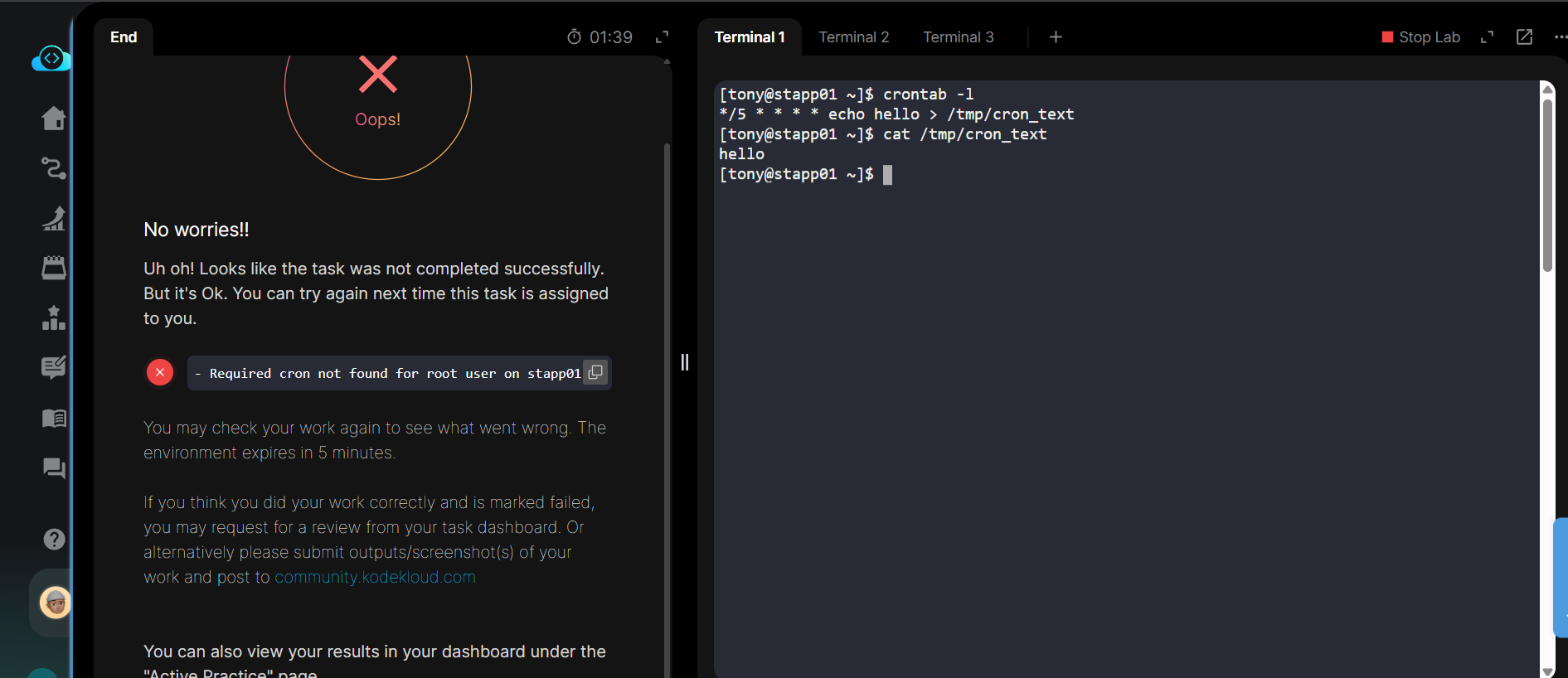 Hi, as I understood you create task under tony user, you need under root, use command sudo -i to switch to user root