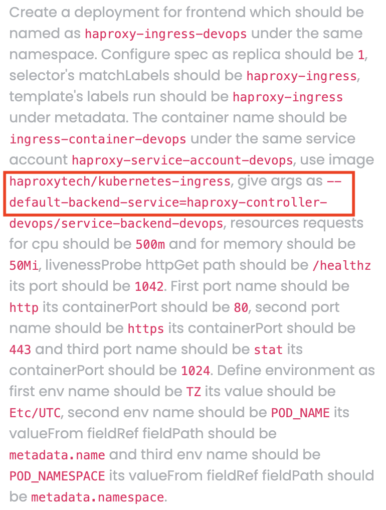 I did this challenge today and the description still had the wrong port for liveness probe. Since I used the correct port (not the one in the description), I failed. Even the space between “–” and “default-backend-service” was still there, which took me a while to figure out because a space is legit if you generate your skeleton manifest with kubectl create deployment -o yaml --dry-run=client NAME ... -- MORE_ARGS