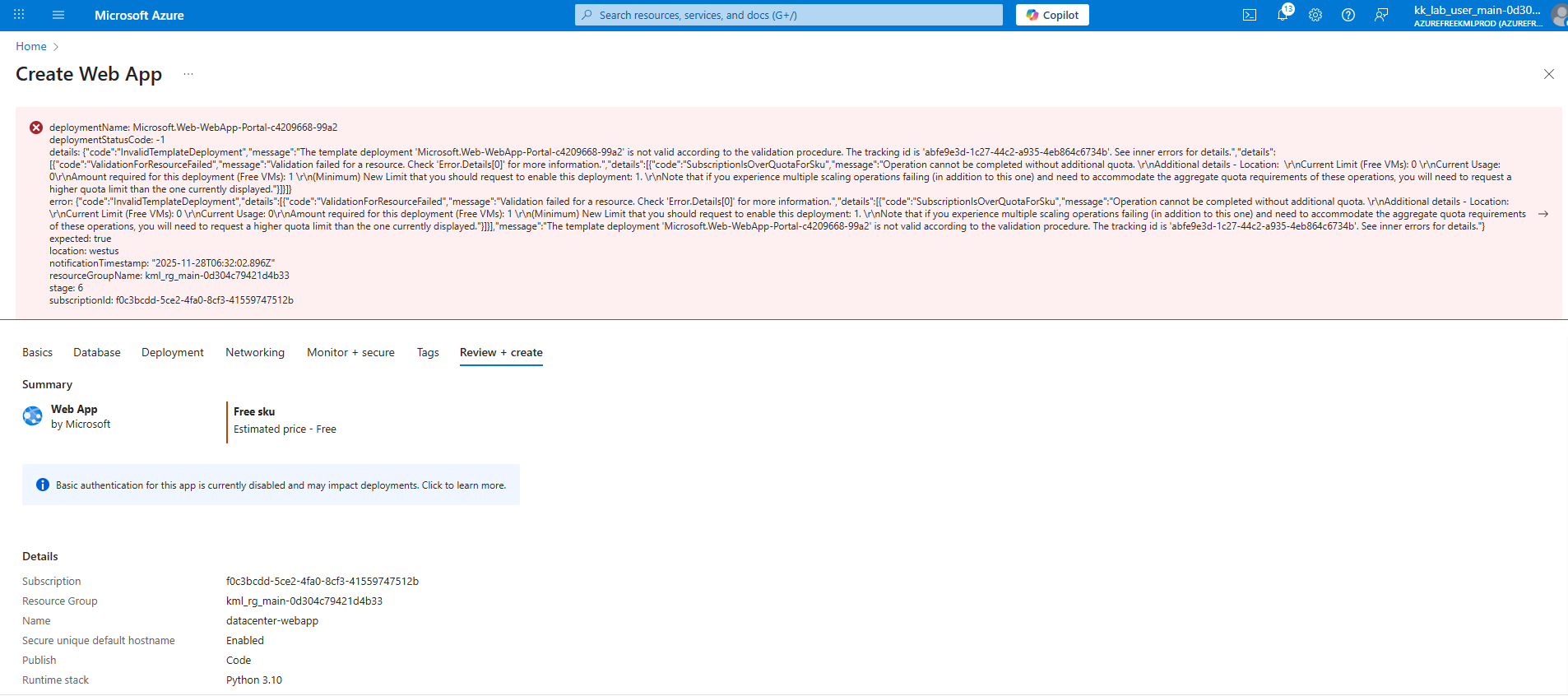 I tried to deploy Web Application as according to lab and hitting the same error no matter I choose B1 or Free pricing plan. Showing below error.