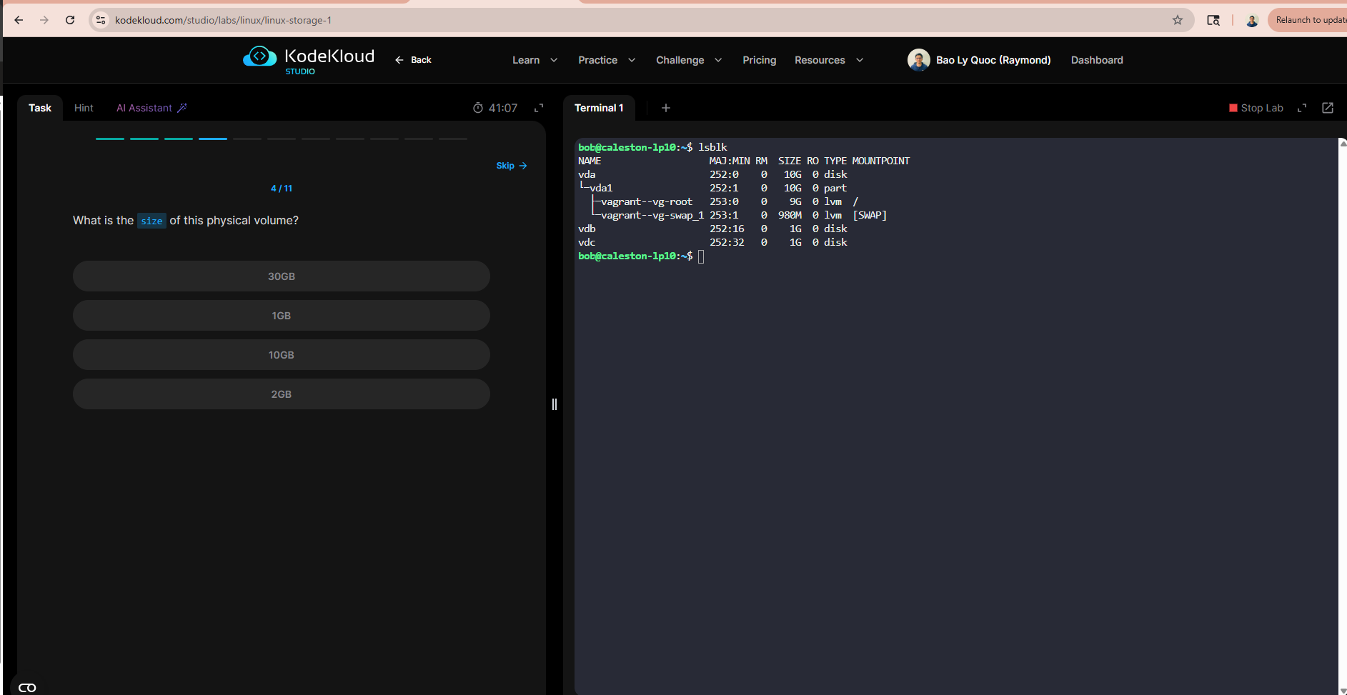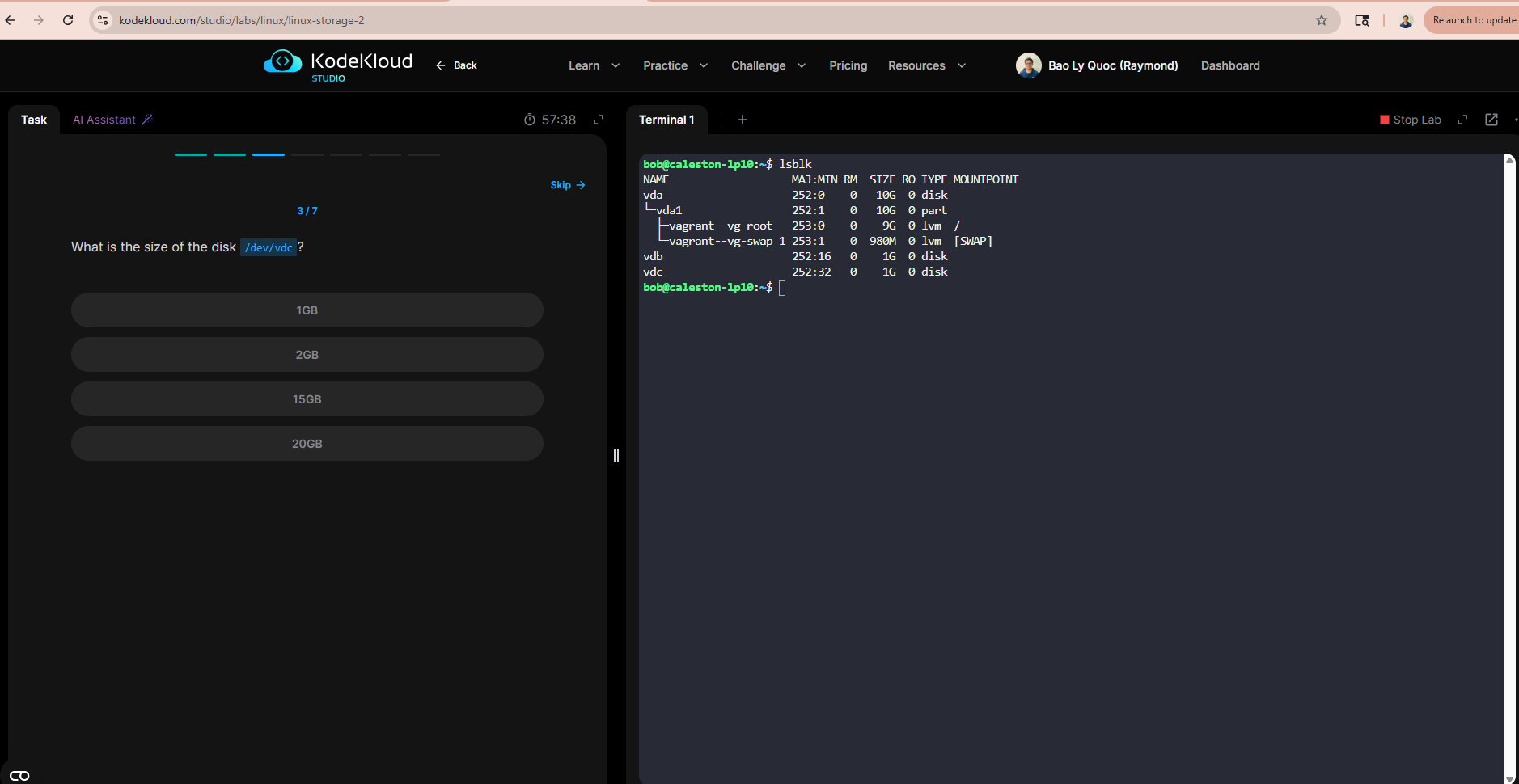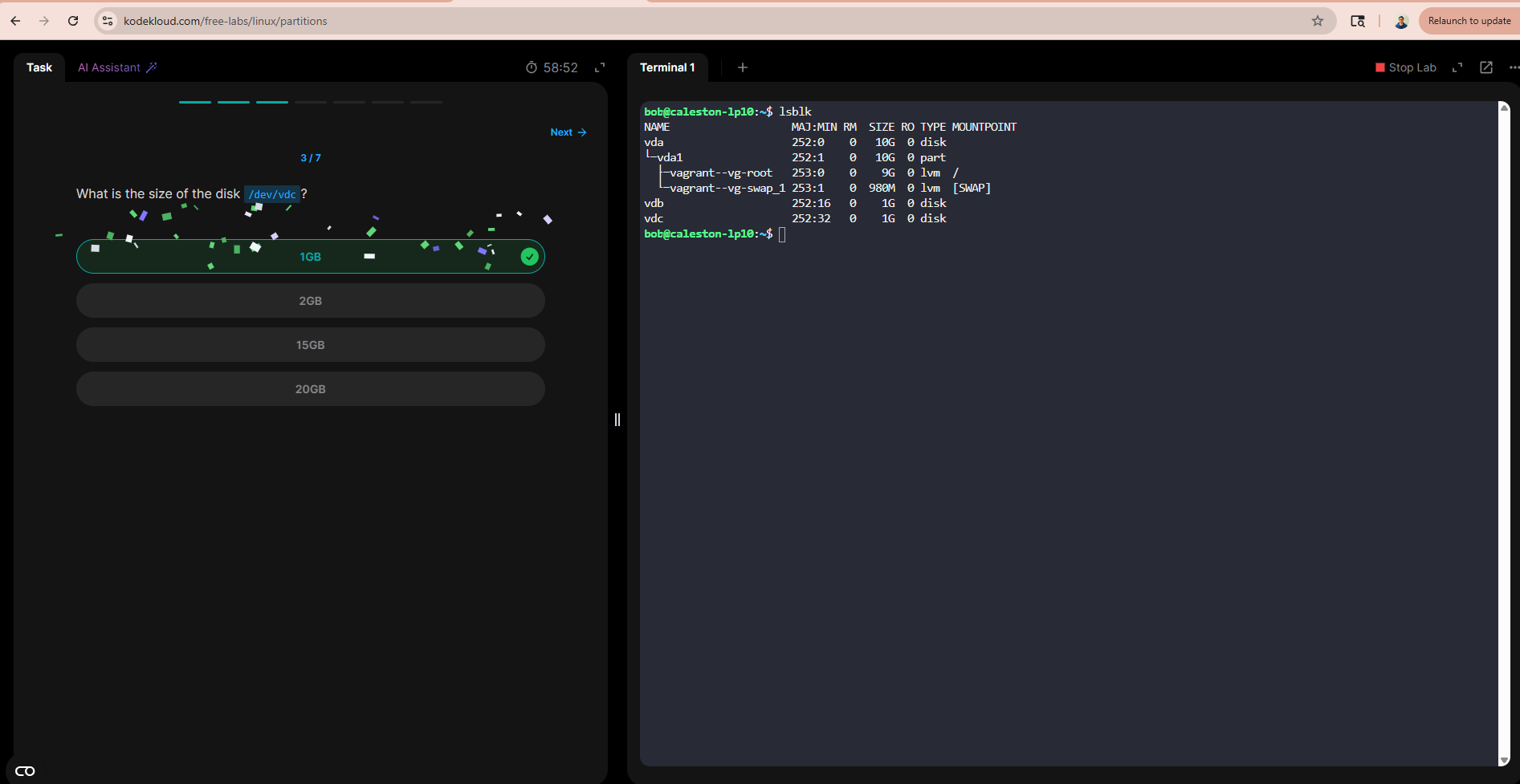 in the Partitions | KodeKloud lab, on step 3, the question is What is the size of the disk /dev/vdd?