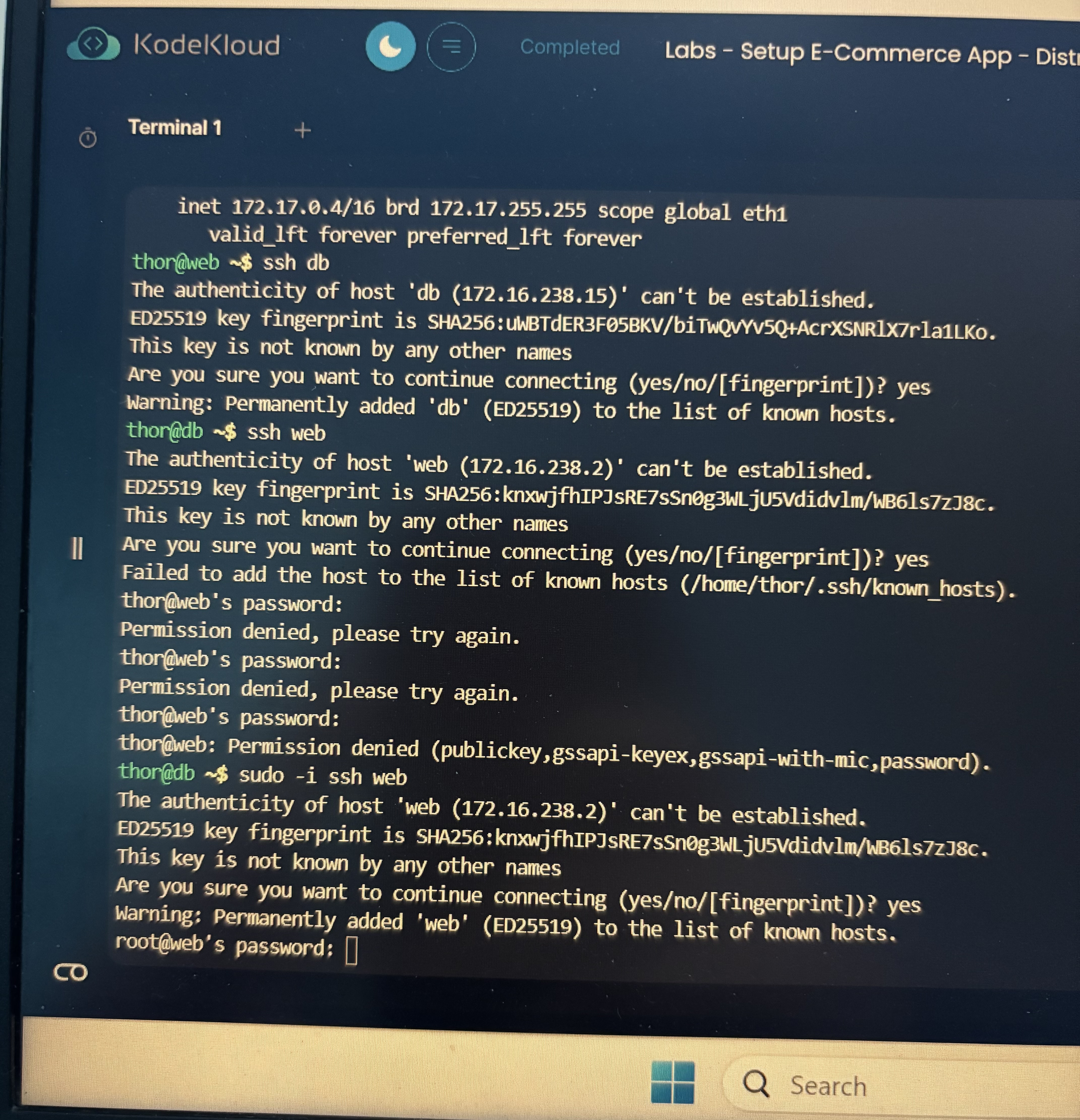 As I said: thor@web is configured for ssh. thor@db is NOT. So you need to exit thor@db to do ssh w/o a password.