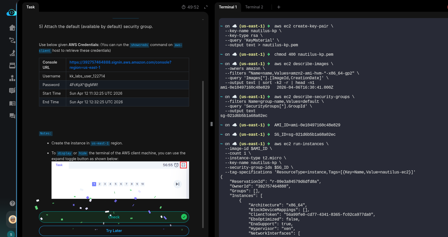 Note: Once the instance is created, we need to wait till the status of the instance transitions to “Running” state before we hit the Check button