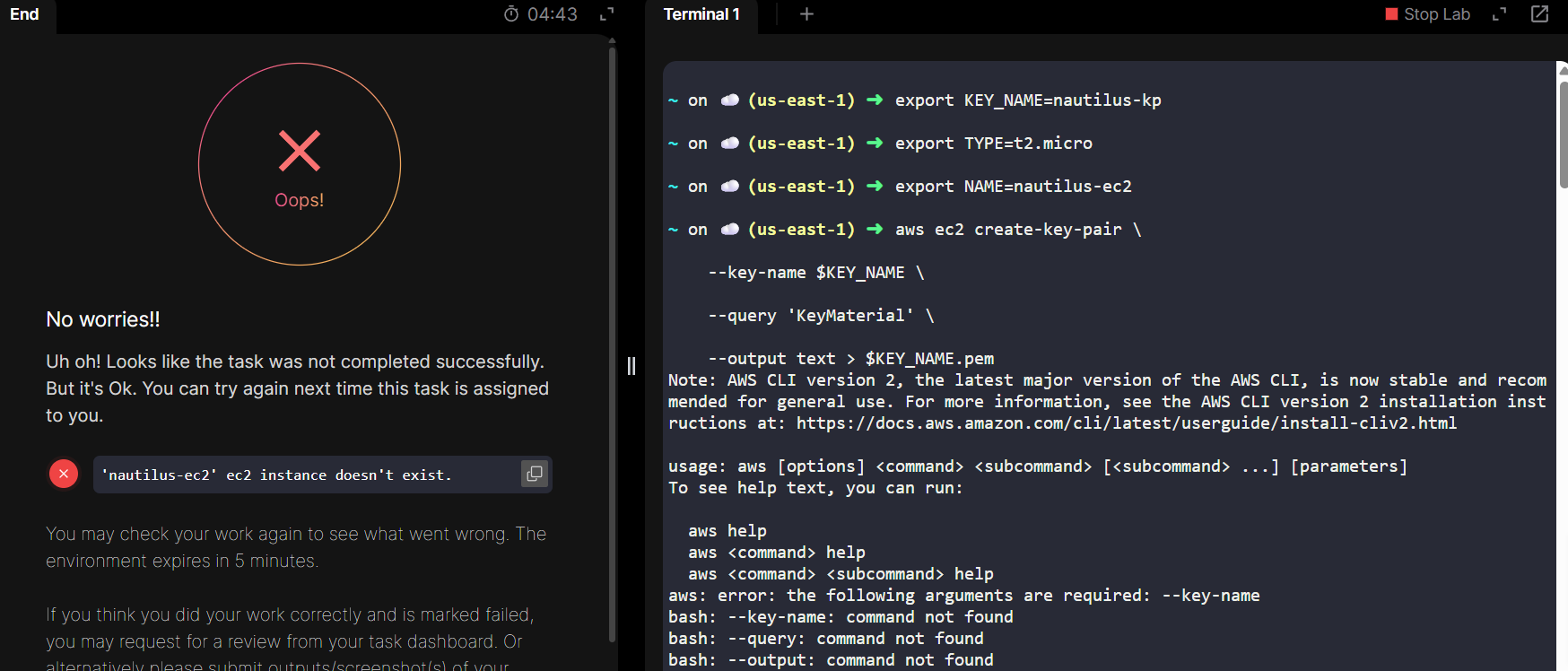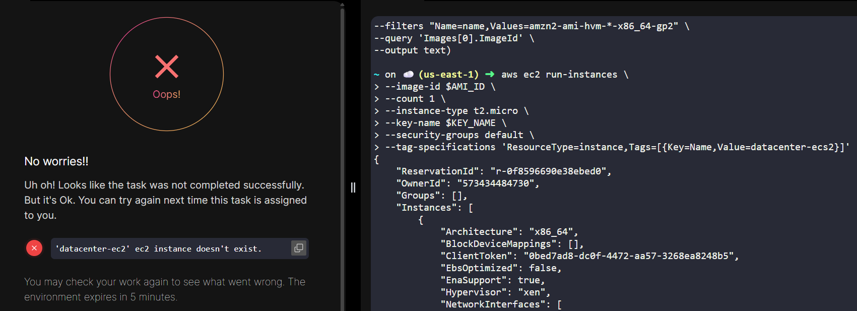 I tried this lab twice, and I was able to launch the Ec2 with the solicited Amazon Linux image, t2.micro as required and rsa key pair, but the check didn’t detected anything.