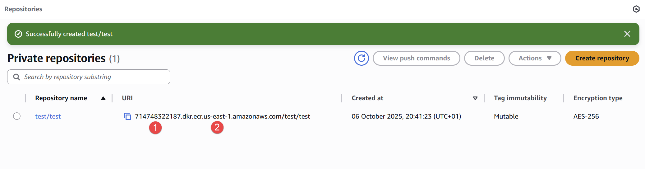 What I did? Copy the URI from the ECR repositories page, paste it into the docker login command and replace the namespace/repo (in this case test/test) with v2