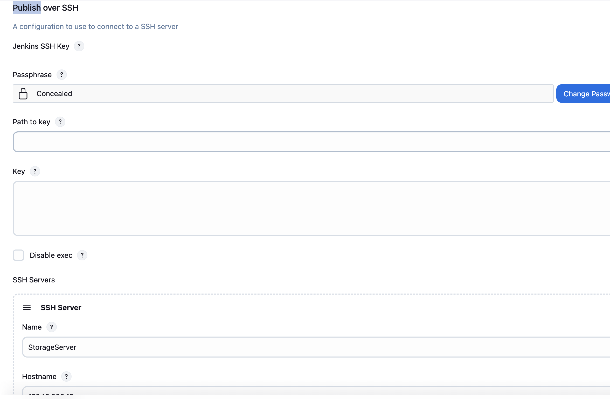 SSH host configuration, under the system configuration of the ‘Publish over SSH’ plugin. The connection test is successful, so Jenkins agent can connect to the storage server. Sorry, I did not take a screenshot of that as the time was over.