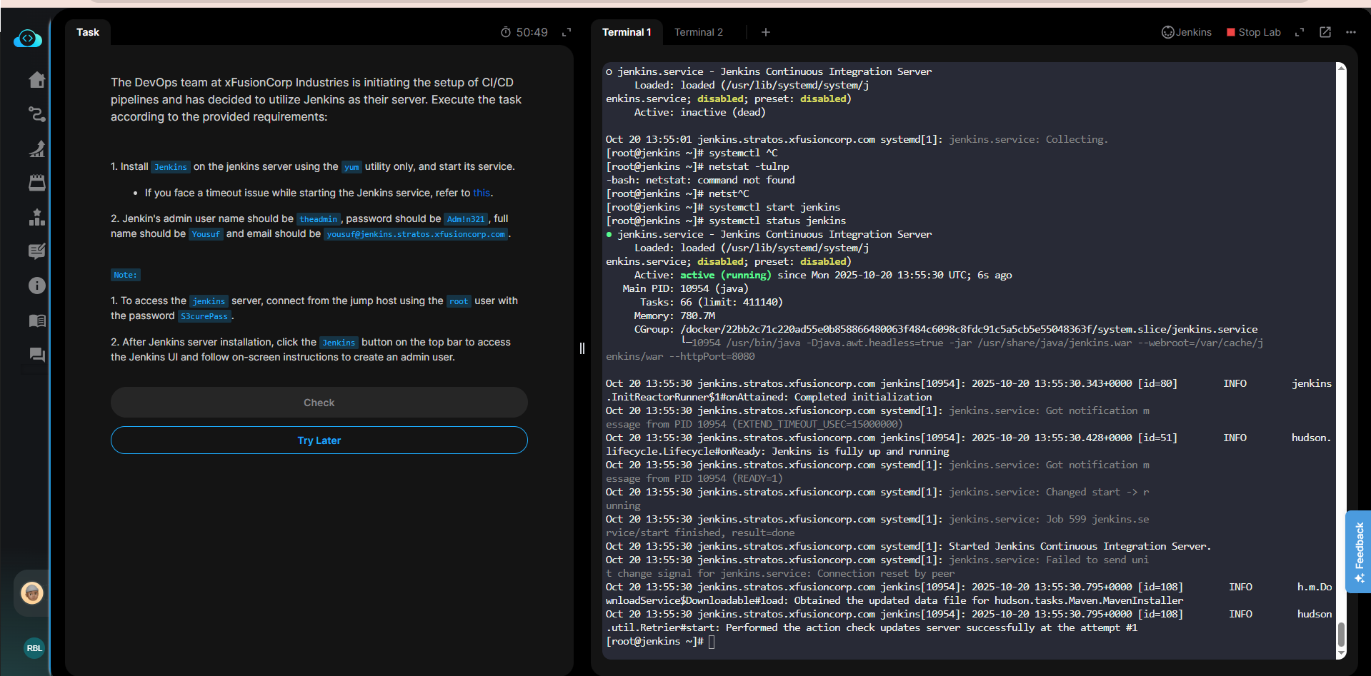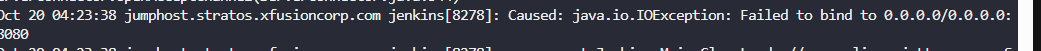 Oct 20 09:20:06 jumphost.stratos.xfusioncorp.com jenkins[9906]: Caused: java.io.IOException: Failed to bind to 0.0.0.0/0.0.0.0:8080. But 8080 is used by ttyd session. I can’t kill.