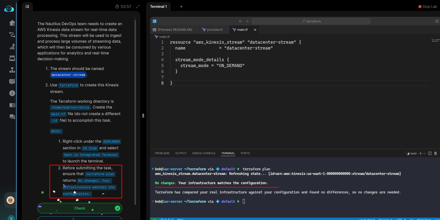 create Kinesis stream using terraform. you can find it in level 1 of terraform