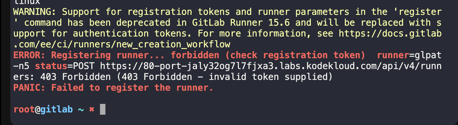 WARNING: Support for registration tokens and runner parameters in the ‘register’ command has been deprecated in GitLab Runner 15.6 and will be replaced with support for authentication tokens. For more information, see