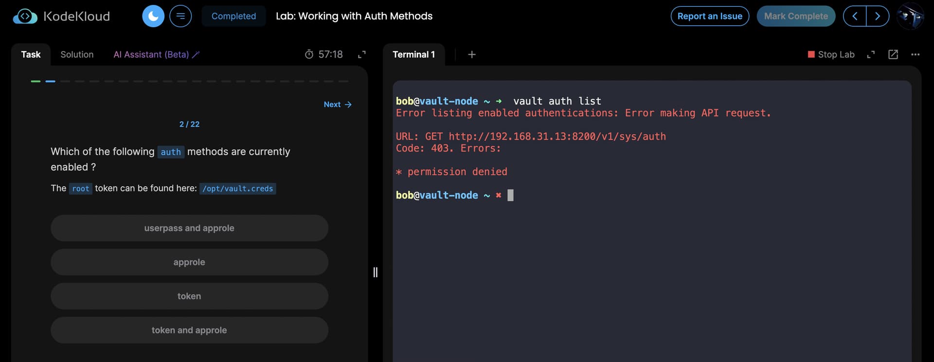 In HashiCorp Certified: Vault Associate Certification course I have a problem with Lab: Working with Auth Methods