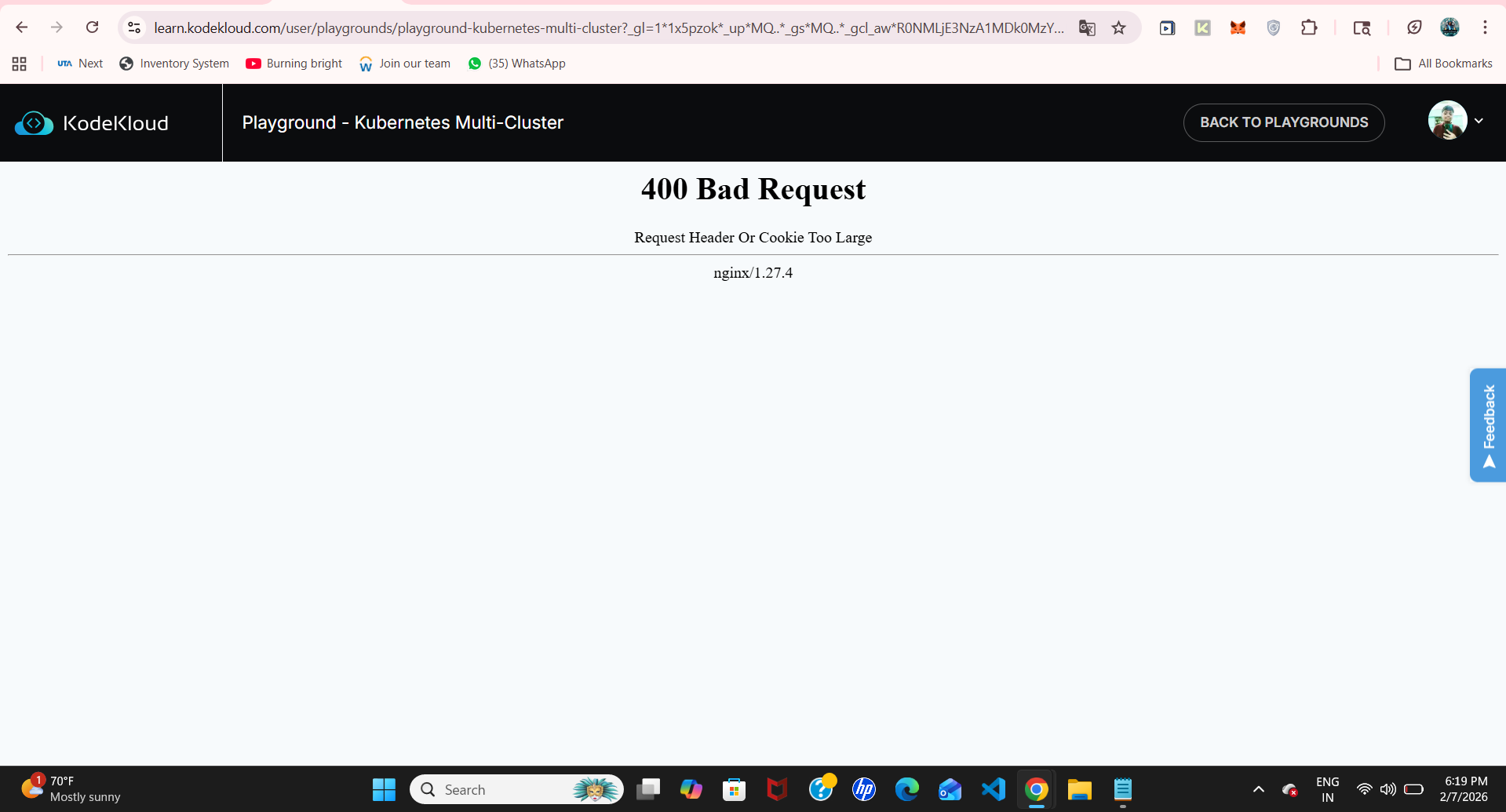 Here the error is spot on – you need to clear your cache for the kodekloud.com domains, because there’s something in your cache that’s too large. Do that and this error will go away.