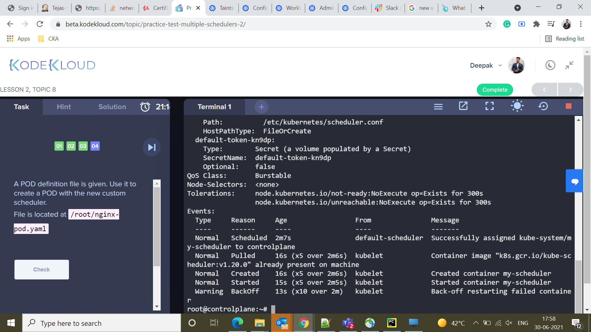 Hi, In Multiple Scheduler lab, I have changes the --leader-elect and add scheduler-name in the yaml. but after a minute my-scheduler will be in CrashLoopBackOff stage. Is there anything missing from my side ?