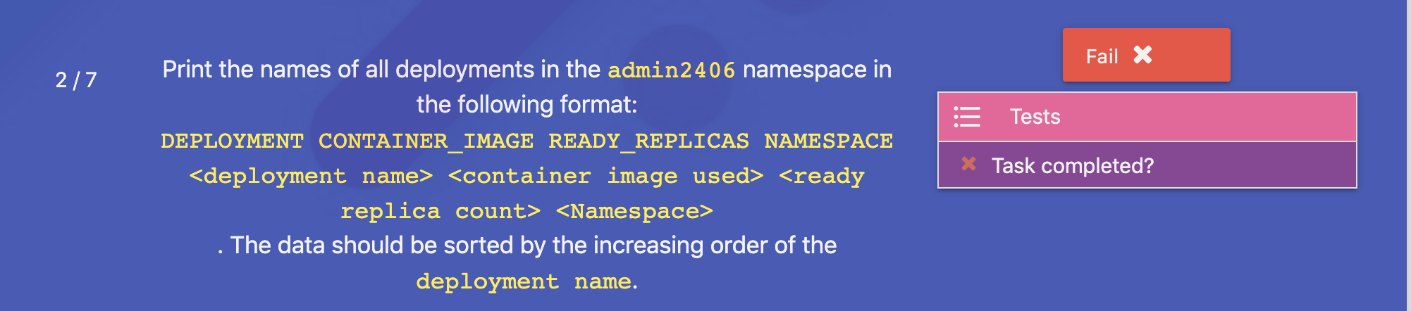 This should work :- kubectl -n admin2406 get deploy -o=custom-columns=DEPLOYMENT:.metadata.name,CONTAINER_IMAGE:.spec.template.spec.containers[*].image,READY_REPLICAS:.status.readyReplicas,NAMESPACE:.metadata.namespace --sort-by=.metadata.name