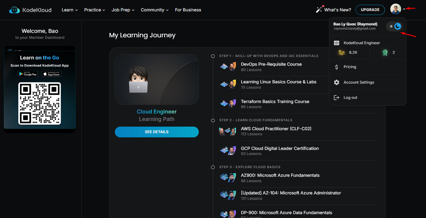 Recently I cleared my browser cache and after that whenever I use KodeKloud, I see black background… Earlier I have been using light background…which is much more soothing. Please let me know how to revert back to light background color of my KodeKloud UI.