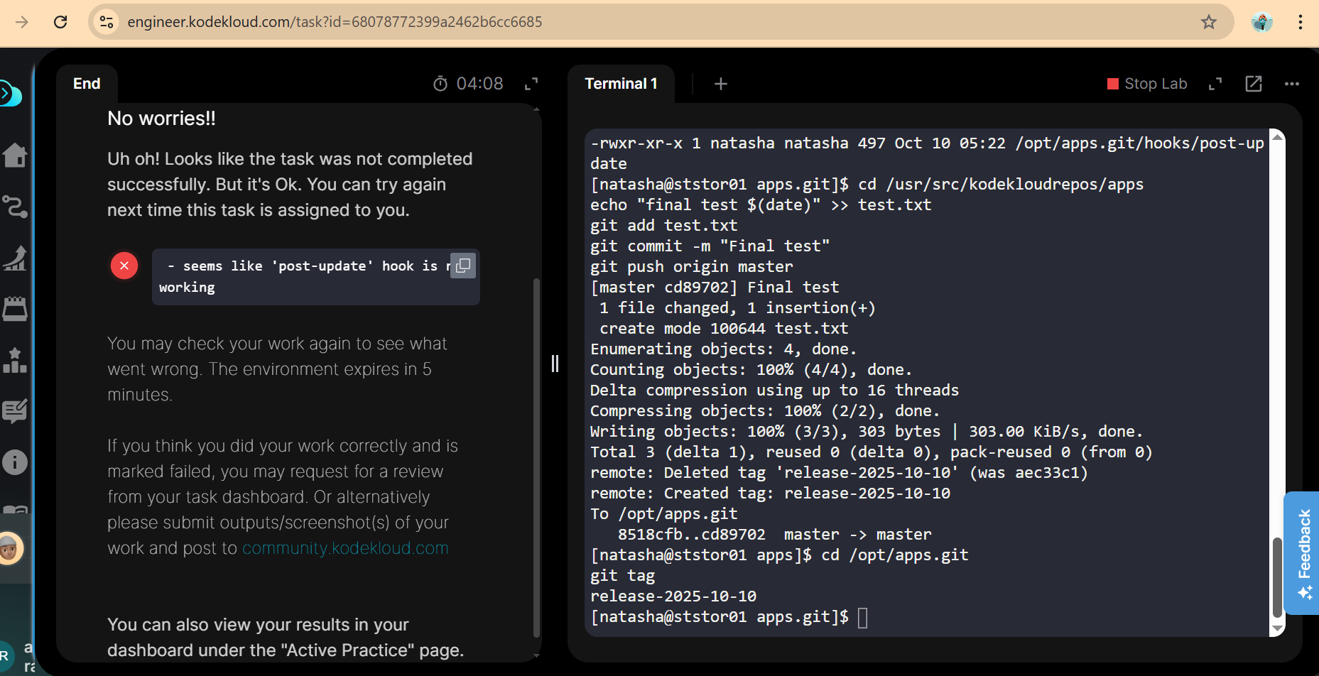 I am participating in the 100 Days of DevOps Challenge and have completed the task for setting up the post-update hook on the repository /opt/apps.git as per the instructions. I have followed all steps using the natasha user, ensured repository permissions were not altered, merged the feature branch into master, and pushed the changes.