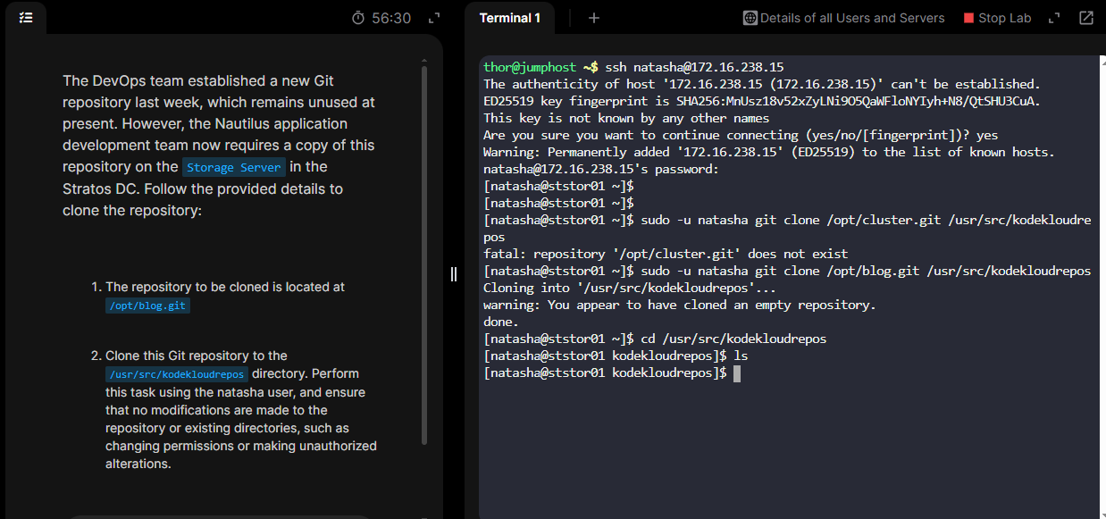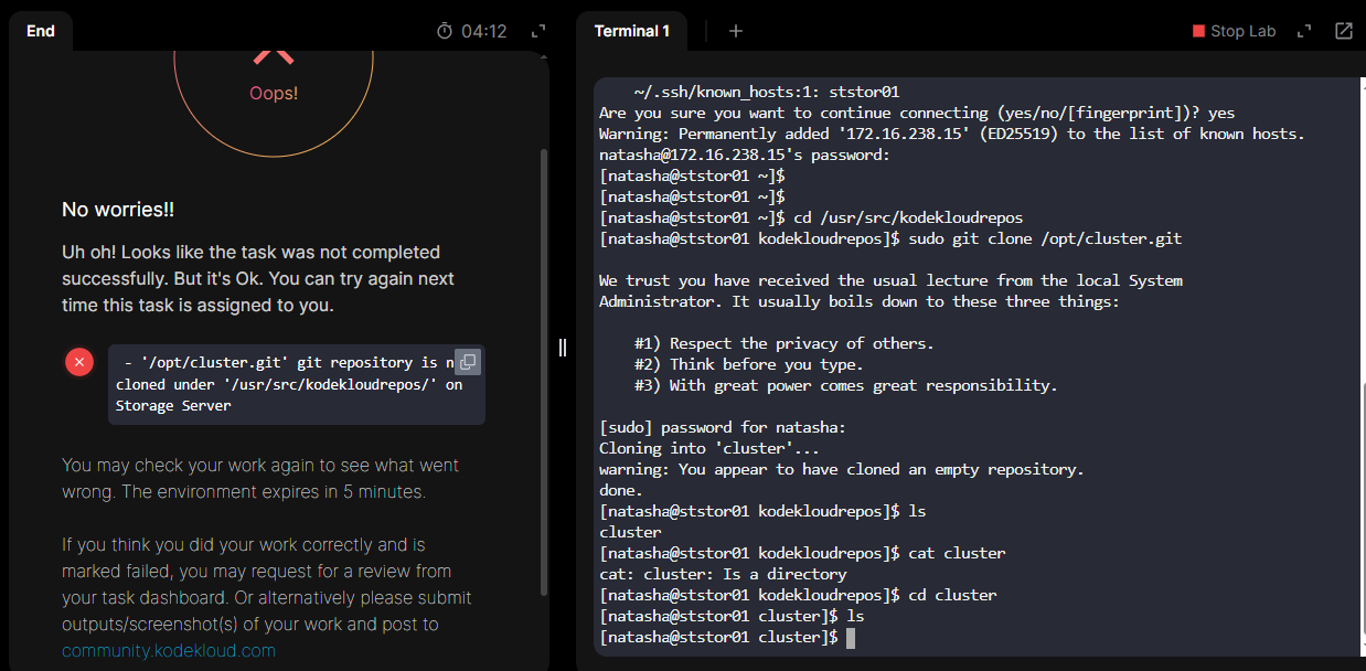 Are you working from a solution that lists the original repository as something different from /opt/cluster.git? Also, you need to read the instructions carefully – it asks you to execute the instructions as user natasha, not as root, as you are doing here.