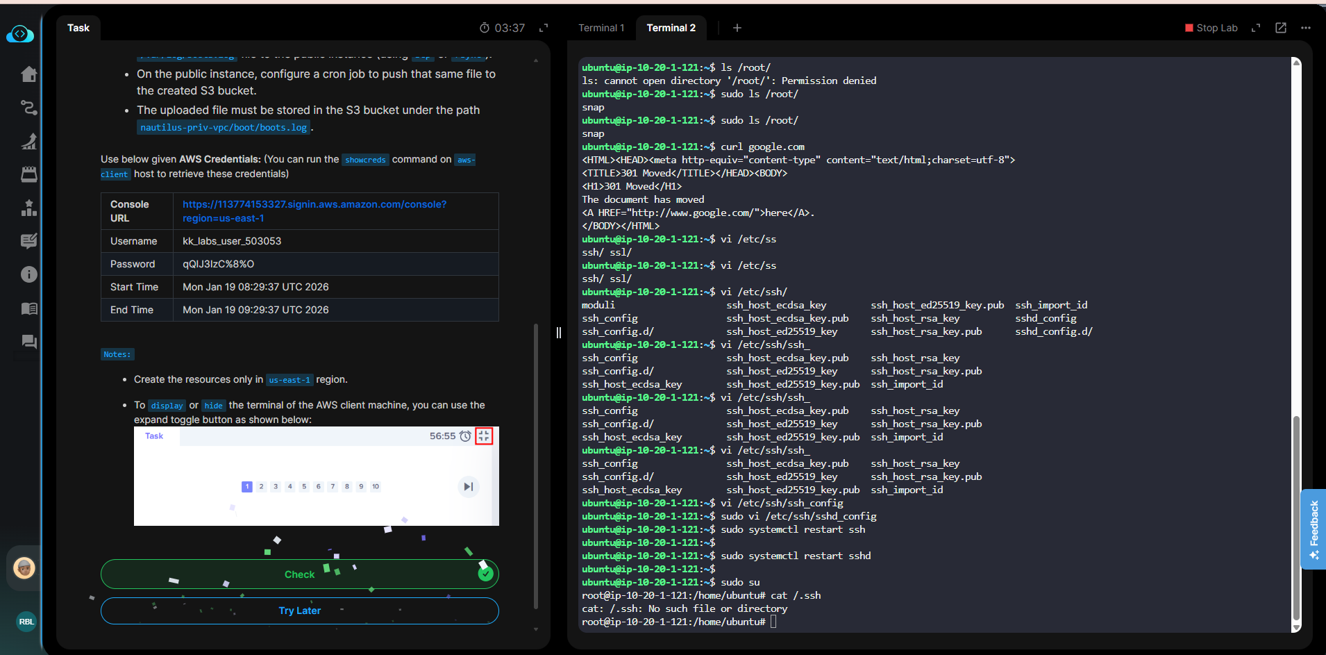 My solution differed from that one only on details not mentioned in the scenario, like possibly the cron had to be every minute (I had every 5 minutes, and public instance was set 1 min later than the private one), or the IAM had to allow all buckets whereas mine was more secure, or maybe the ssh user had to be root instead of ubuntu which is bad practice.