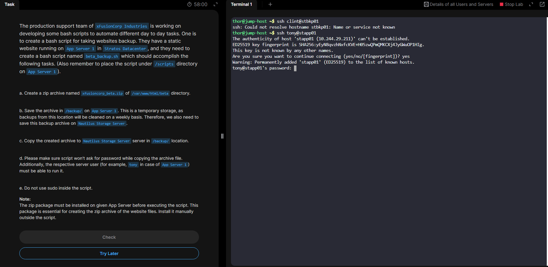 Please note that the task asks you to put the backup files ==> on the Storage Server <== NOT on the backup server. If a server is not used in a task, typically it will not be available in the task’s environment. So stbkp01 likely DOES NOT EXIST IN THE ENVIRONMENT.