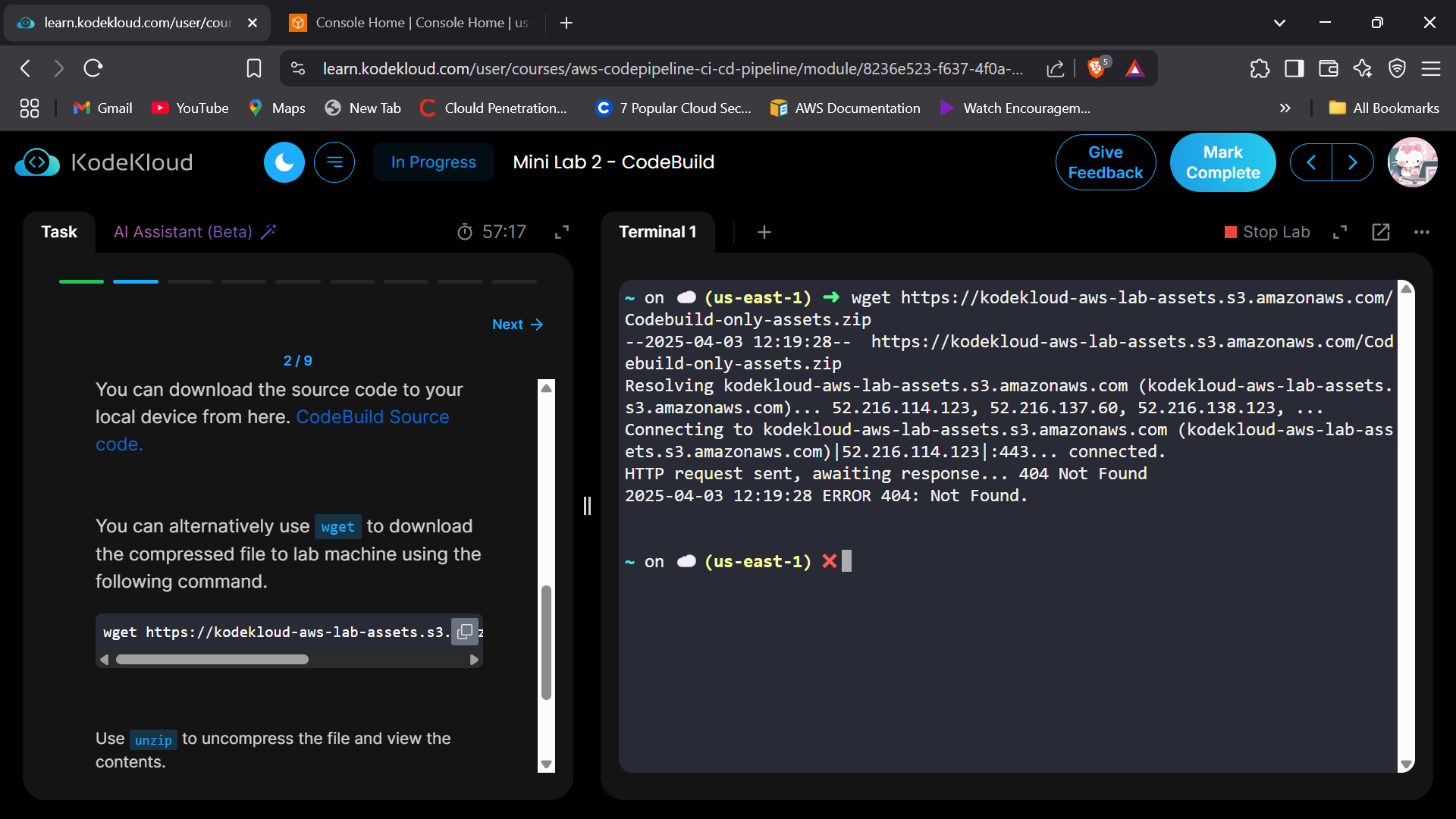 Hello, I’m currently working on CodeBuild Min Lab 2 and ran into an issue while trying to download the source code. The wget command is returning a 404 Not Found error.