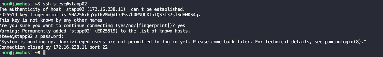 I’m seeing this error when I tried to do Day 10 challenge https://engineer.kodekloud.com/task?id=680675da5500bdf7ab9a7b2a&status=start, this is the error I’m getting “System is booting up. Unprivileged users are not permitted to log in yet. Please come back later. For technical details, see pam_nologin(8).”