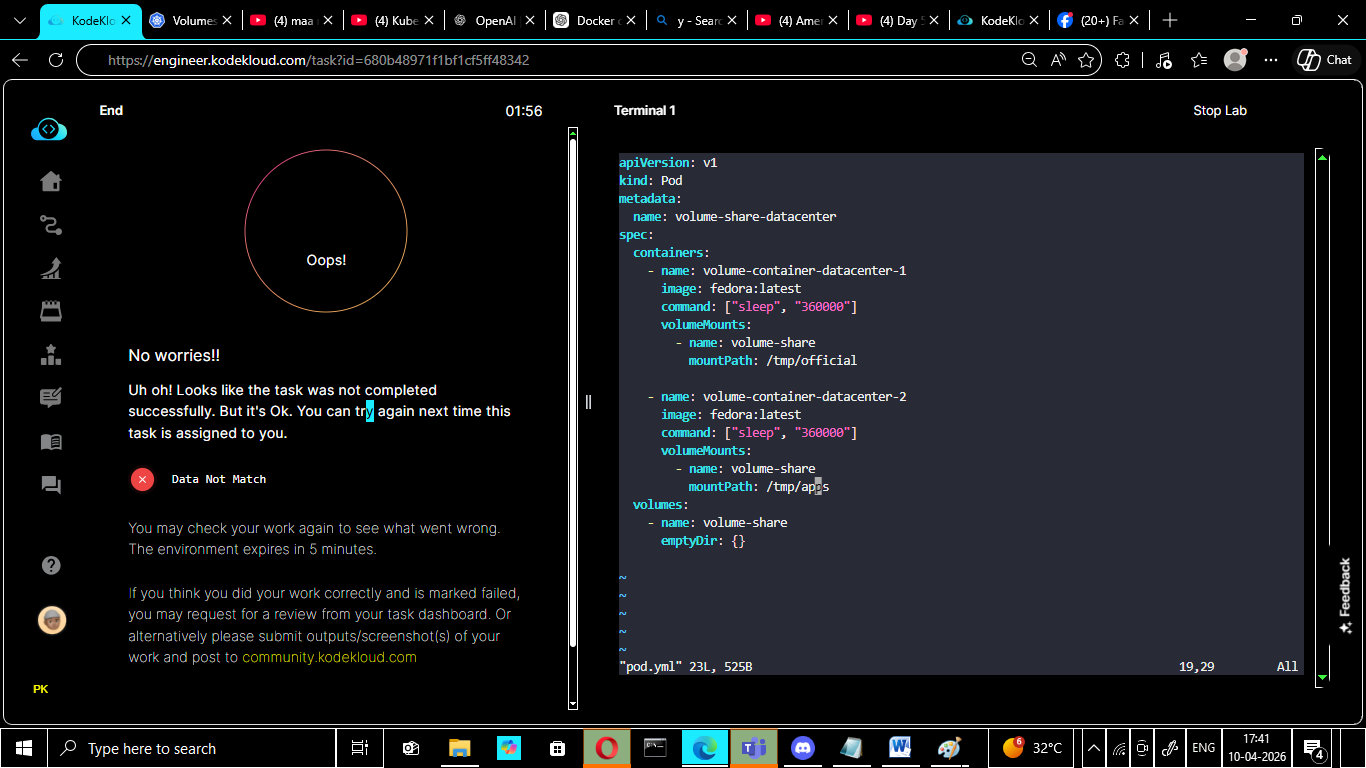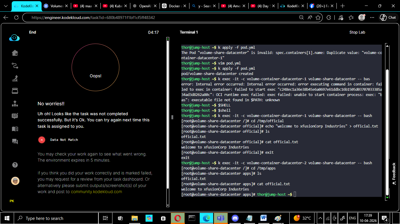 I am writing to report an issue with the “Volume Share Datacenter” lab on the KodeKloud platform. Despite completing the task correctly and verifying the expected outcomes, the lab result was marked as “Data Not Match.”